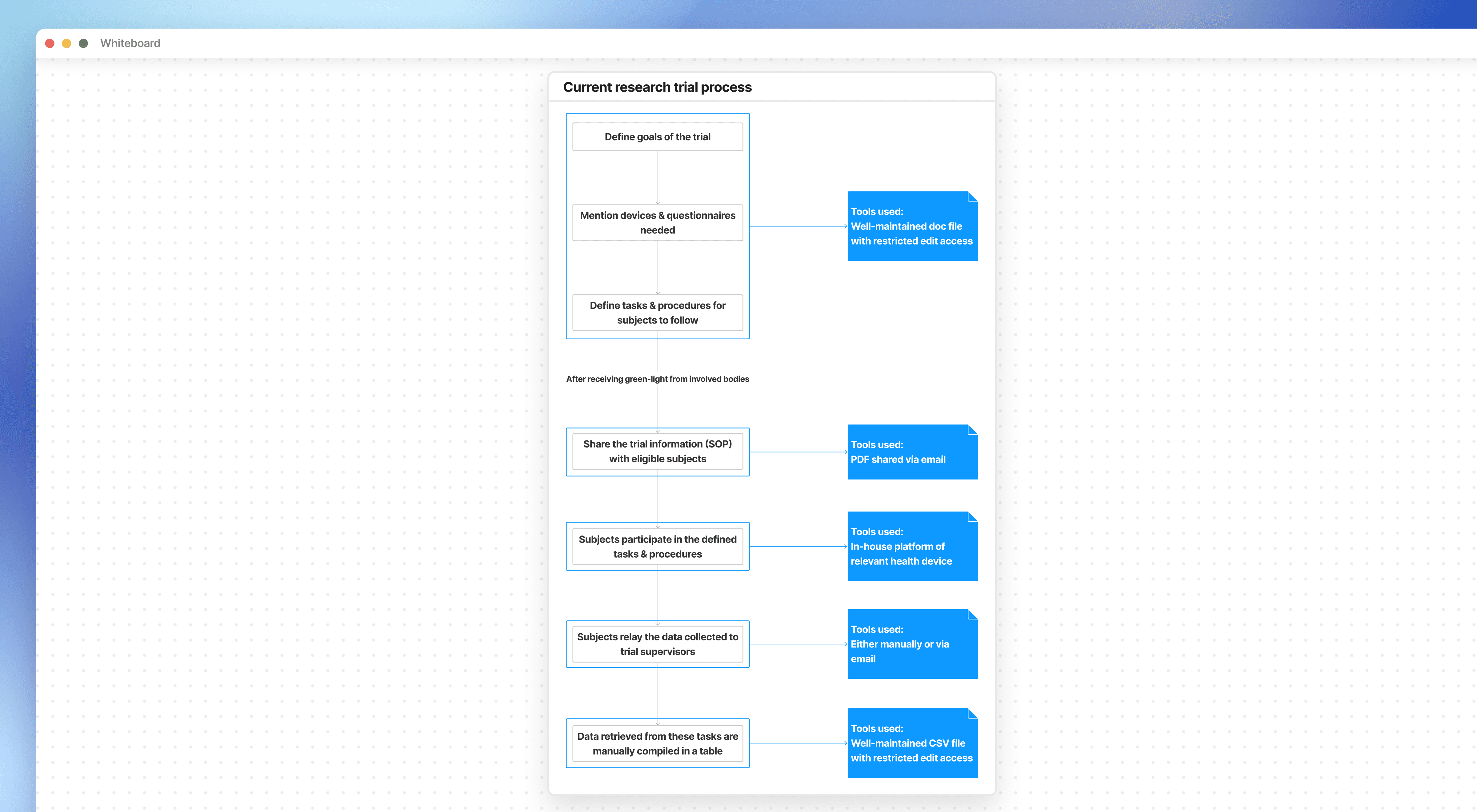 Armed with reliable and actionable insights, we mapped the current clinical trial flow. In this flow chart, we have included all the steps involved in a trial, and we have mapped each step with the tools used.