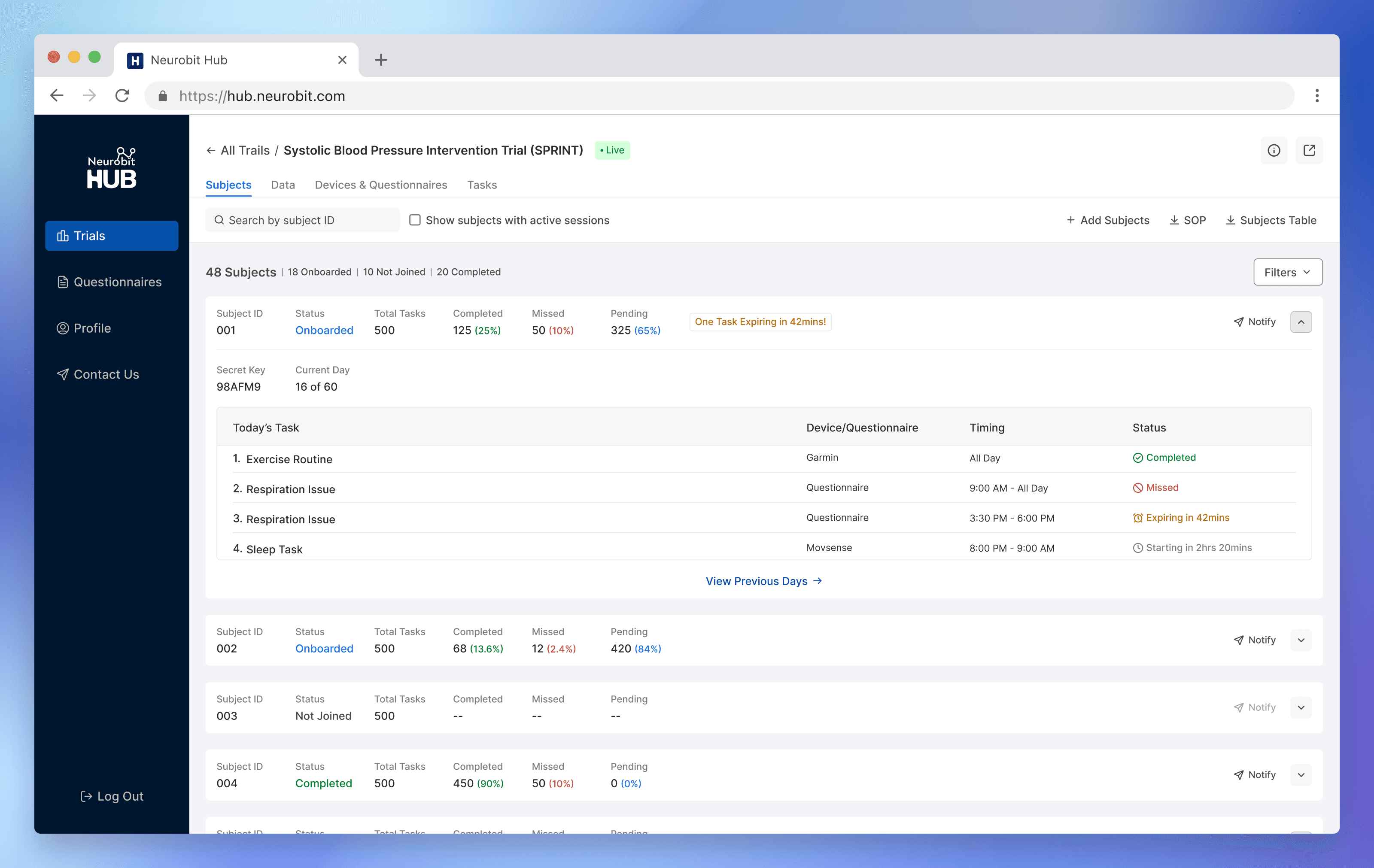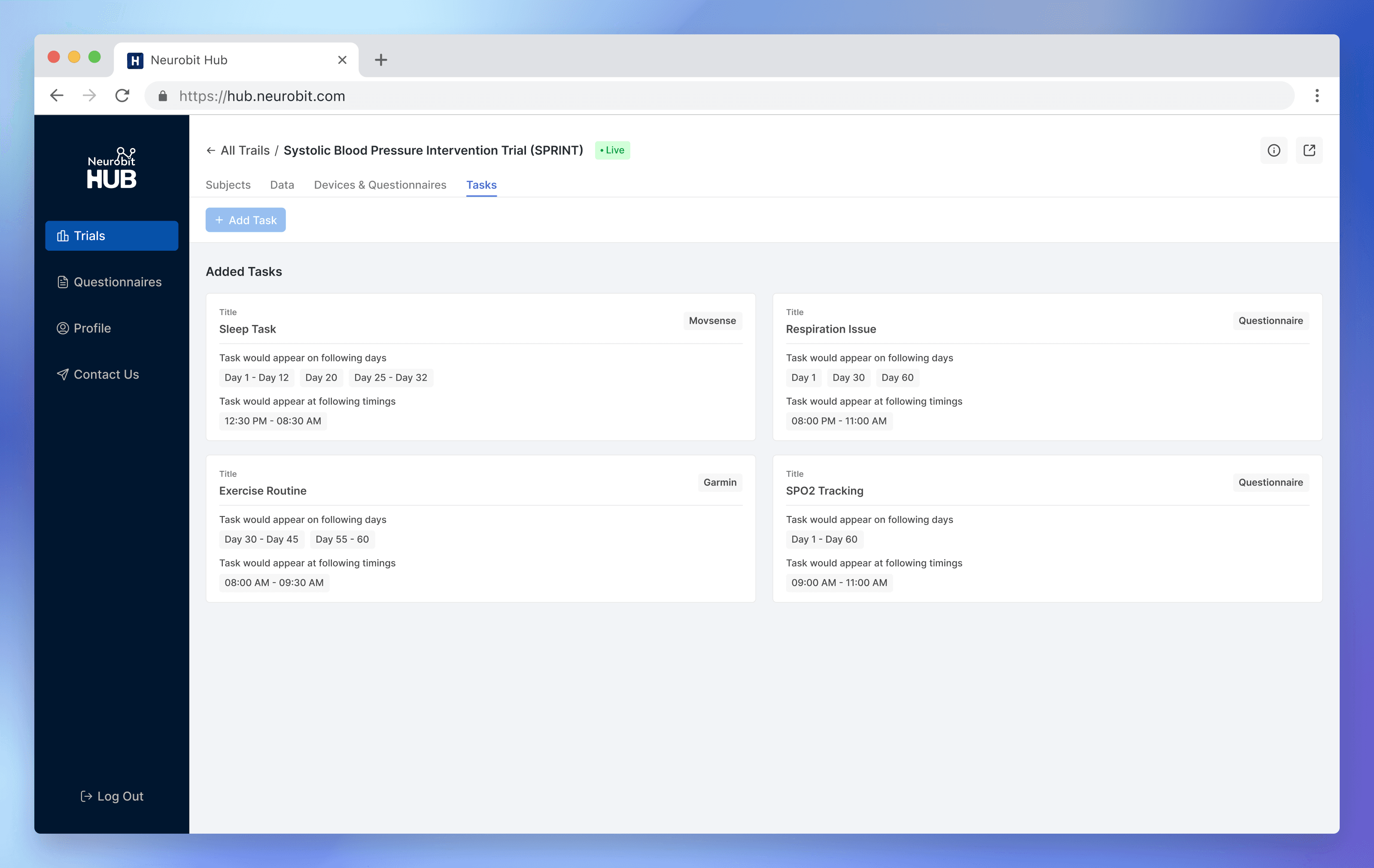 Neurobit Hub is a comprehensive health research platform which enables individuals and organisations to effortlessly conduct research trials by streamlining the various steps involved and providing all stakeholders with valuable features.